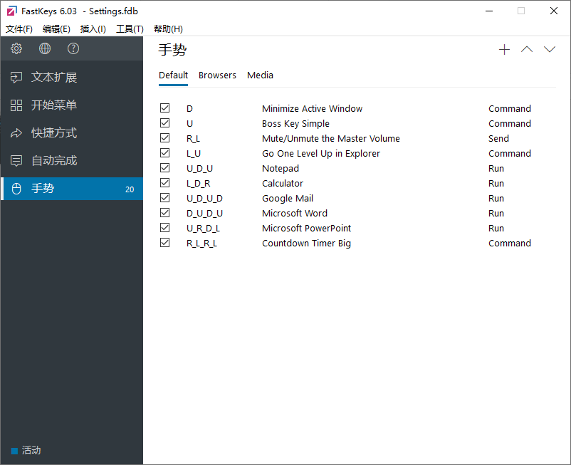 fastkeys破解版作为电脑指令自动化执行工具,用户可以设置开始菜单、手势指令以及快捷方式,让电脑可以自动执行各种命令,比如运用于连点、循环任务等场景,可以减少人工操作,解放双手,还能自定义脚本。