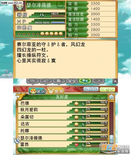 在前部的基础上画面和系统都进行了增强,首先从男女主角中选择进入物语,组成队伍一起去迷宫中进行探险,在游戏中栽培、宠物捕捉、结婚生子、养殖元素完美的保存,给玩家带来裸眼3D的视觉震撼。