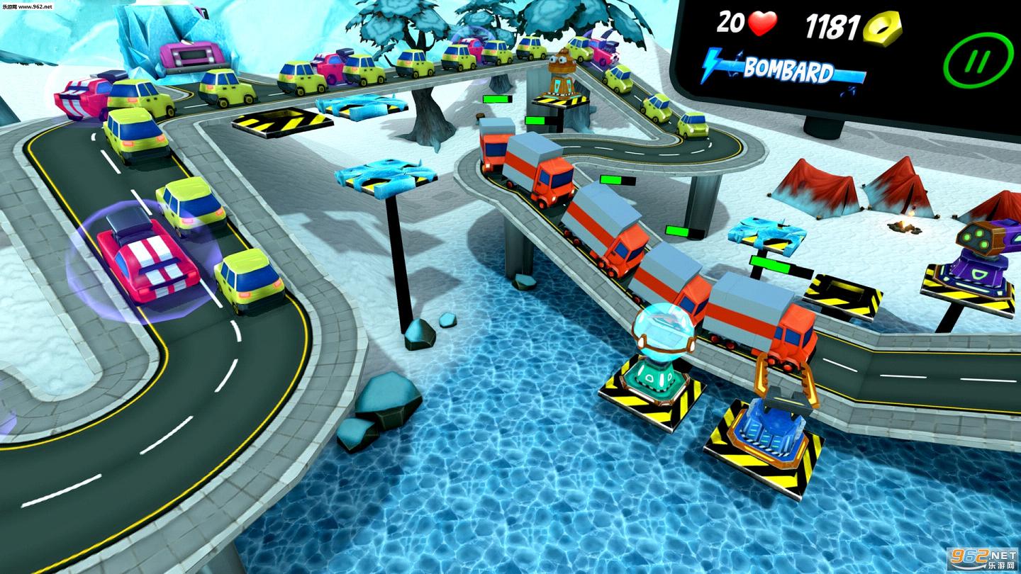 卡通风格的休闲塔防游戏,讲述的是一群被邪恶机器人控制小汽车,从而导致交通堵塞,玩家需使用五花八门的武器来清理它们,同时也要注意及时给武器升级。该游戏不但拥有精美的3D地形和画面,而且还有着特殊武器来帮助玩家。游戏目前已有7张可玩性极强的正式地图,玩家能够在游戏中通过建造包括导弹发射塔,冰霜发射塔,以及死亡电磁炮塔在内的各种先进武器来打击敌人。另外,其正式版本添加了更加有趣的发展系统,玩家能够将通关获得的奖牌来增加属性,这些增加的属性被允许在之前曾通关的地图上使用,玩家可以对每一张地图进行任意次数的攻关,从而不断刷新纪录。喜欢休闲塔防游戏的玩家可以试试。