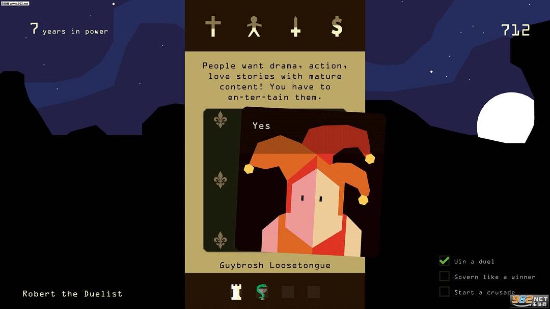 《君王朝代(Reigns)》是由Nerial制作,Devolver Digital发行的一款融合了结合模拟经营和策略元素的创意卡牌游戏。玩家在游戏中将扮演国王,你需要作出各种选择来治理国家,游戏还拥有非常众多的随机事件,内容十分丰富。