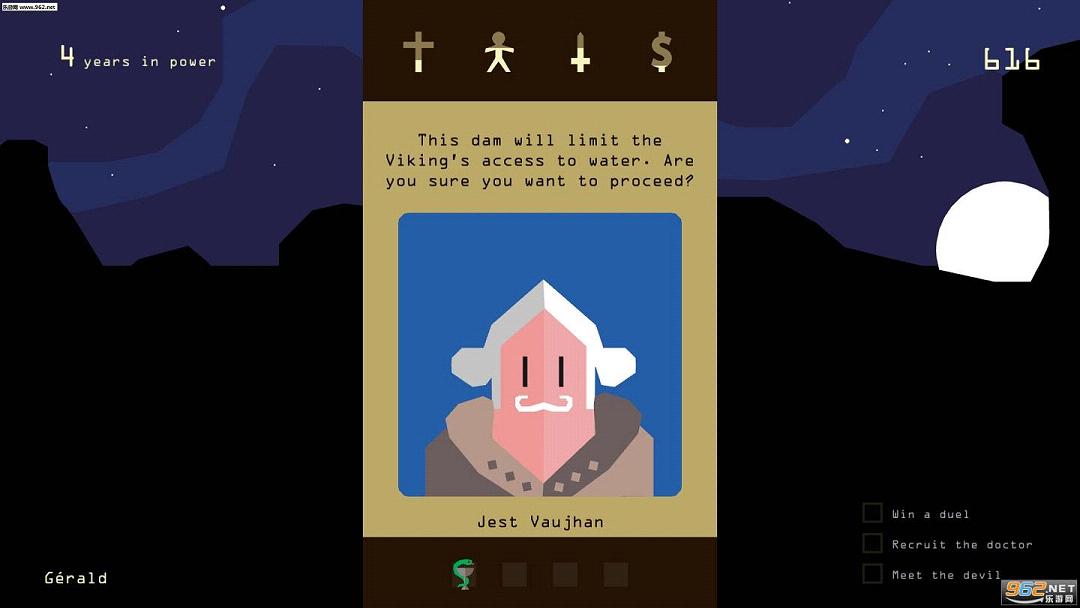 君王朝代的玩法很简单,你的面前有宗教,人民,军事,金钱四个指示表,而在游戏界面的正中央,是一摞卡组,通过不停的抽卡,你将面临着不同的事件,卡牌上的人物会问你问题,而你可以通过左划右划决定是否修建一座可以防护大水却会消耗大量金钱的堤坝,或是决定与哪位小姐开始新的恋情,但对于每一张卡,你只能选择两种路线之一。你的每个选择都会对计量条产生影响,满格了,你会被踢出国家,没了,也一样。