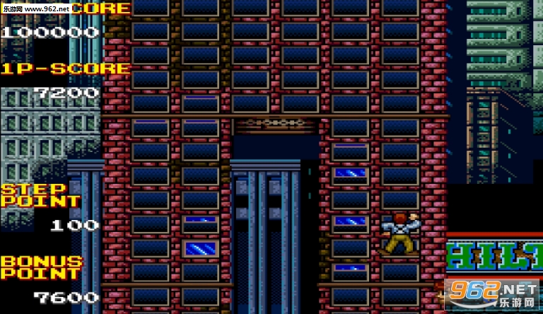 实际上,玩家真正苦手的部分还是在向楼顶进军时所遇到的形形色色的敌人.半空中不断产蛋的秃鹫,伸出手臂干扰攀爬进程的巨猿,从窗口往外丢花湓的中年人,带电的霓虹灯广告牌,丝毫没有掉落规律的哑铃和钢筋,还有最致命的会关闭的窗户.经历如此众多的磨难,攀到楼顶,看好时机,抓住直升机的降落架才算过关。