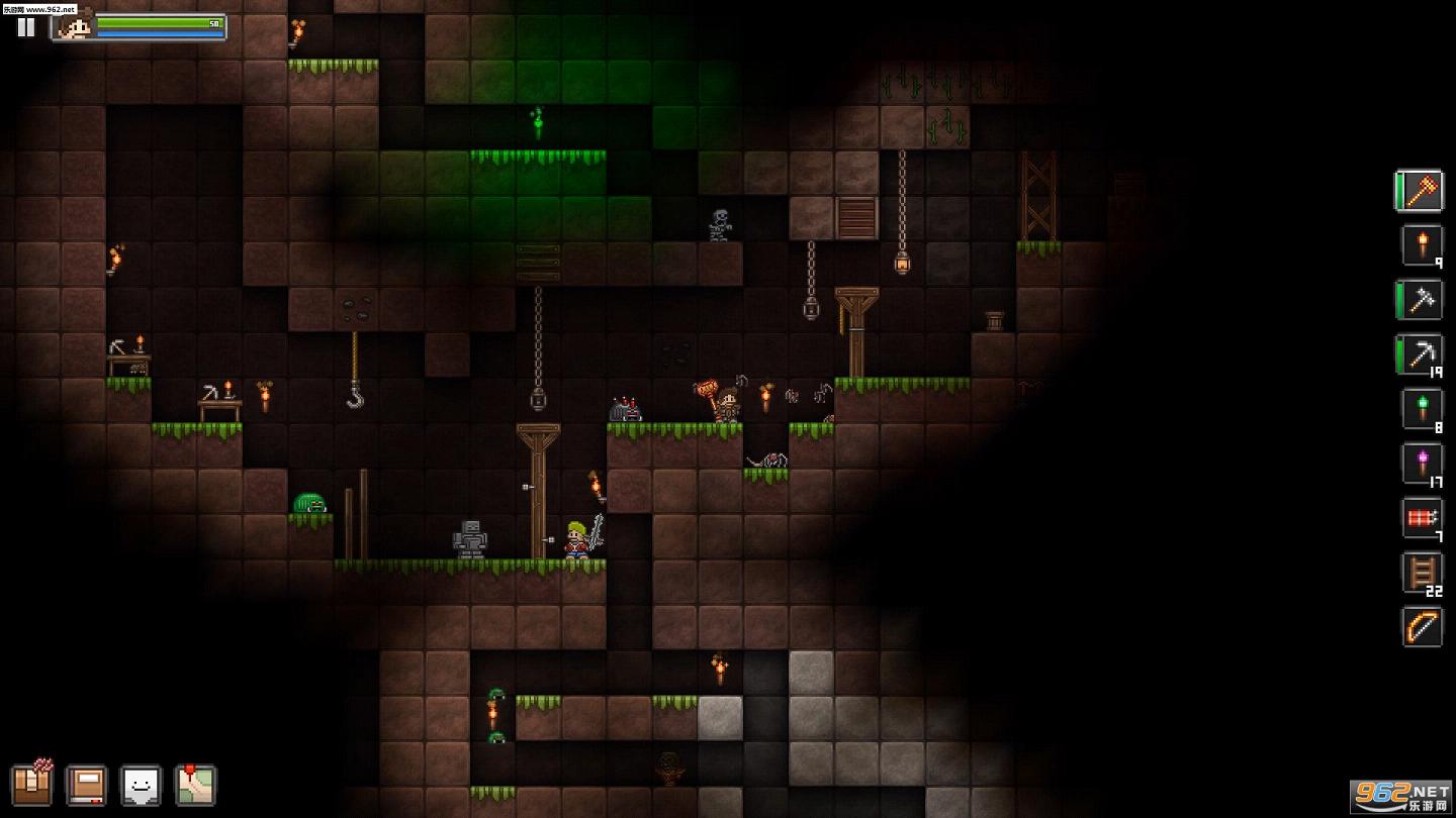 人物的走动上,游戏一改 Minecraft 一类的四个方向总动,变成了水平方向的走动,不仅省去了摇杆的麻烦,而且在地图挖的千疮百孔的时候也不至于晕了头,不管是砍树、挖地还是杀怪,在 Junk Jack 中,你只需选择合适的工具即可,剩下的只需点击了!