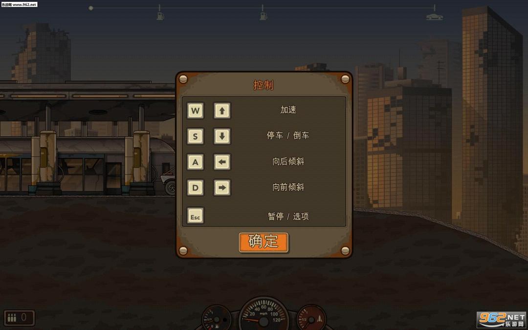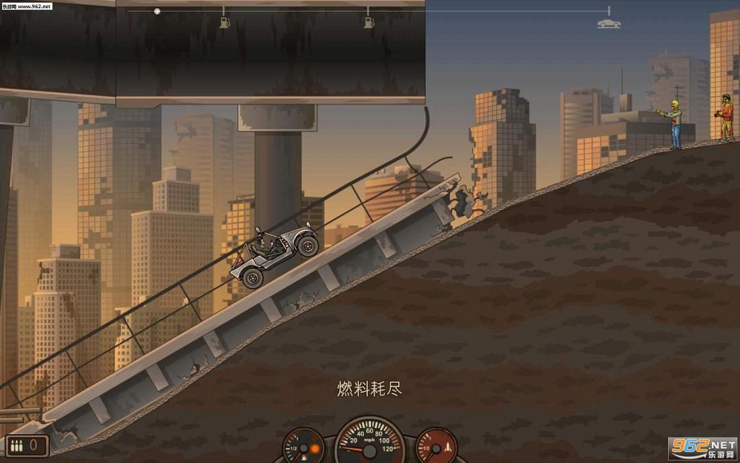 操作方式也比较的简单,若是玩过一些越野赛车游戏,想必玩家更能明白游戏其中的要素。游戏是以虚拟按键进行控制,共三个按键,分别为控制车头抬起的上升键和车头低下的下降键,此外还有游戏中最重要的加速键,可以说玩家全程都必须按着加速让车子狂飙。而整个场景的道路会遍布各种障碍物与僵尸,它们都会对车辆造成一定的减速,若是一口气到不了终点多半是因为速度冲不起来造成的,因此玩家撞向障碍物是尽可能找薄弱的位置撞去,而僵尸在没有武器的情况下则尽可能的把车头抬起将其碾压,若是直接撞上不但会造成减速,僵尸还会挂在车上提升车子的重量。