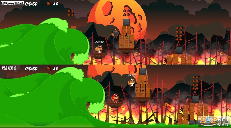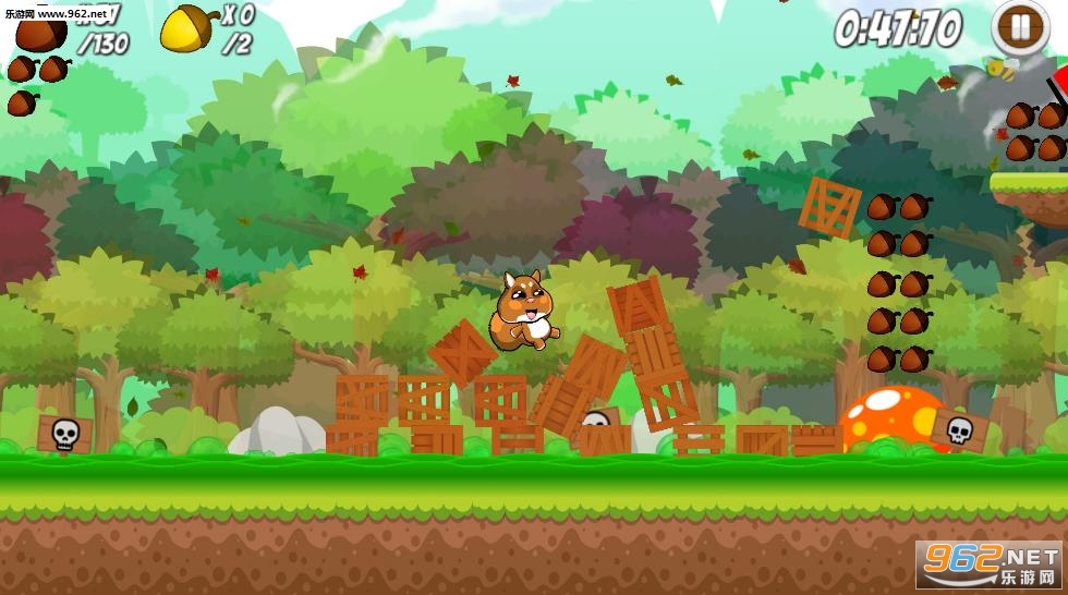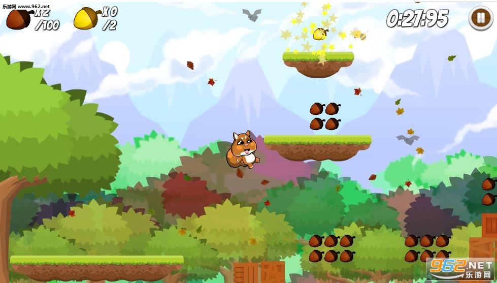 森林里发生了奇怪的事情,有毒的液体和古怪的生物从天而降,作为一直可爱的松鼠,借助各种平台到达终点,当然别忘了拿走路上的松果!要注意有些箱子不要推倒,通过箱子可以跳跃到更高的地方拿松果!!!