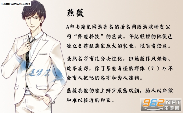 坦白讲,虽然在很长一段时间内凌霜都是我在自己笔下所有现代文中最爱的男主角,可是现在却更喜欢燕薇这种成熟的有责任感有担当的阳刚男子,不自私不任性,甚至是责任感过重到令人心疼……虽然这个角色并没有什么特别悲惨的过往,但他真的是特别令我心疼……当然,具体这里就不能再多说了,请大家去游戏中自行体会~】