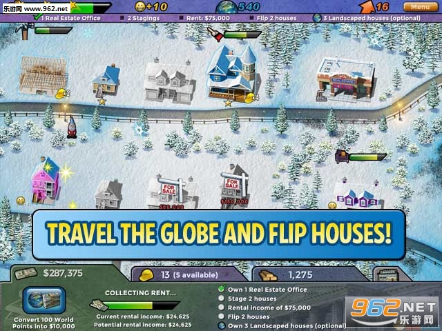《地产大亨:世界》是著名休闲游戏开发商BigFish制作发行的一款模拟经营类游戏,与该公司其他游戏相同,也是达到目标过关,评定星级。画面唯美清新,玩家需要建造房子,完成任务赚取金币,后面关卡较难,需要玩家做出正确的选择与规划。