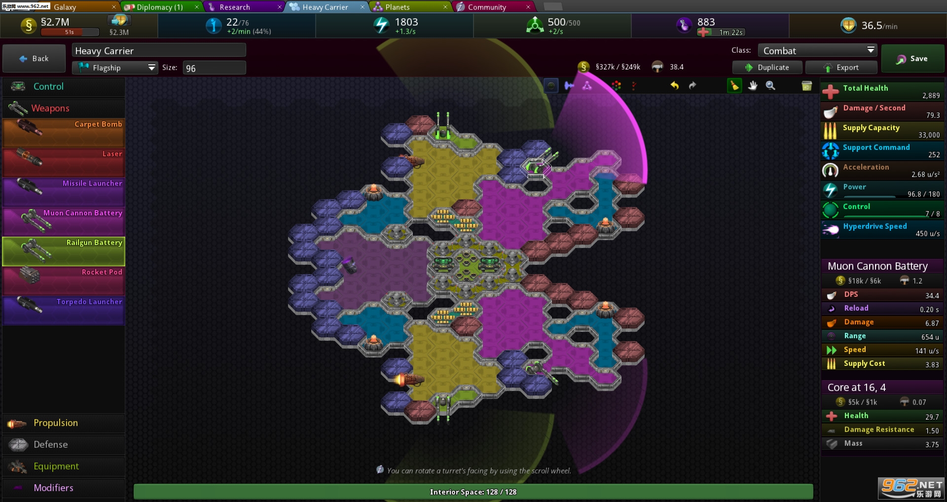 5、优秀的舰船设计。舰船设计一直是太空4X最让人热衷的部分之一,当年太空帝国系列的舰船设计模式给了我很大的震撼,而SR1的圆形设计则更是让人眼前一亮。这一代有很大的变化,首先是原形的外框不见了,取而代之的是……什么框都没有了!以六边形为一个基本单位,每一艘舰船的结构可以随意设计,一艘船的六边形数量是有限的,每一个组件所占用的六边形数量则决定了它的性能。而结构决定了生存率,将装甲置于外层可以优先承受攻击,但是这不代表武器和引擎就可以安然藏在内部,因为大部分的武器和引擎都需要将核心置于船体的最外侧。但是可自由设计的只有结构,舰船实际的外形会根据设计图的样子自动选择模型,或者手动选择。而目前模型的数量非常少,期待官方和mod作者们的更新。