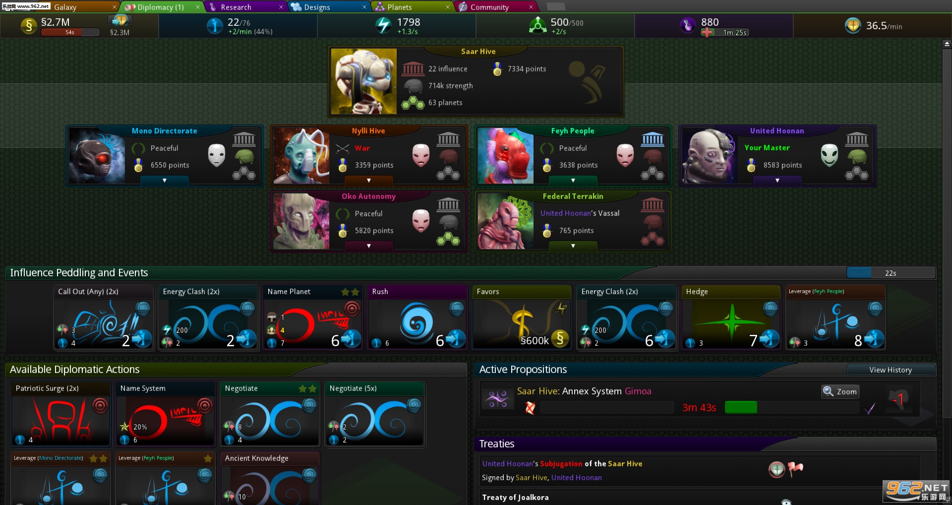 7、卡牌式的外交模式。卡牌主要分为提案、支持/反对,以及一些经济或间谍行为。每一个玩家用帝国产出的影响力抢购卡牌,然后将提案提交给星际议会,所有玩家再使用手中所拥有的卡牌对这个提案进行支持或反对。这个模式让我一开始有点不习惯,不过后来似乎明白了,大概制作组的意思是,卡牌代表着谈判,数量和效力则由帝国的影响力决定,所以影响力大的帝国就必然在议会中占据优势。嗯,很有意思的设定,我也说不准现在AI究竟是如何,有时候它们在对自己有利的提案上毫不吝啬手中的卡牌……