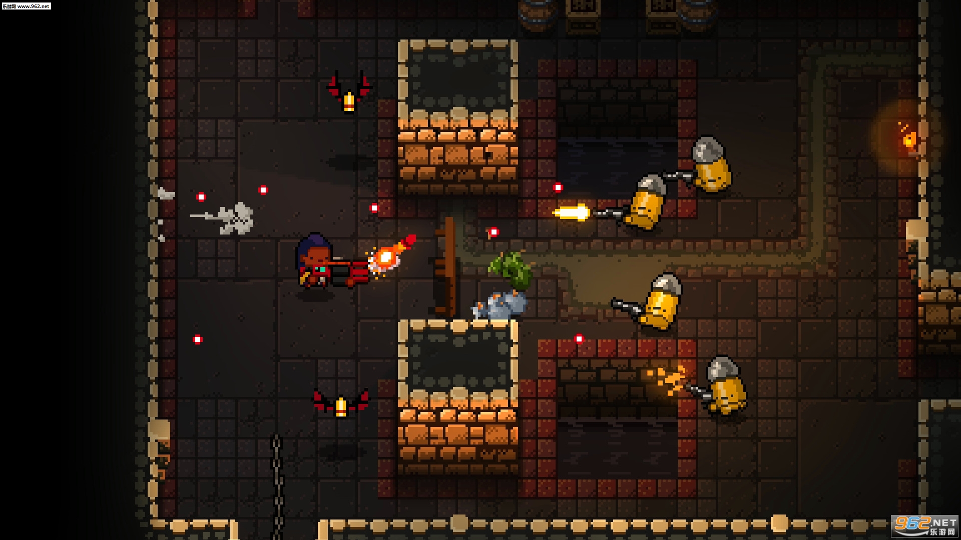 游戏的配乐和音效也是相当的赞,小到空旷地牢中的脚步声,每个关卡之间的开门声都有适当的音效,而角色,怪物们枪械射击的声音更是十分相配。笔者甚至观察到在爆炸桶炸过之后,地面还会出现一圈和周围颜色不同的爆炸痕迹,正是这些一点一滴细小的地方,才让这款像素游戏在玩家上手时说不出的舒适和亲切。