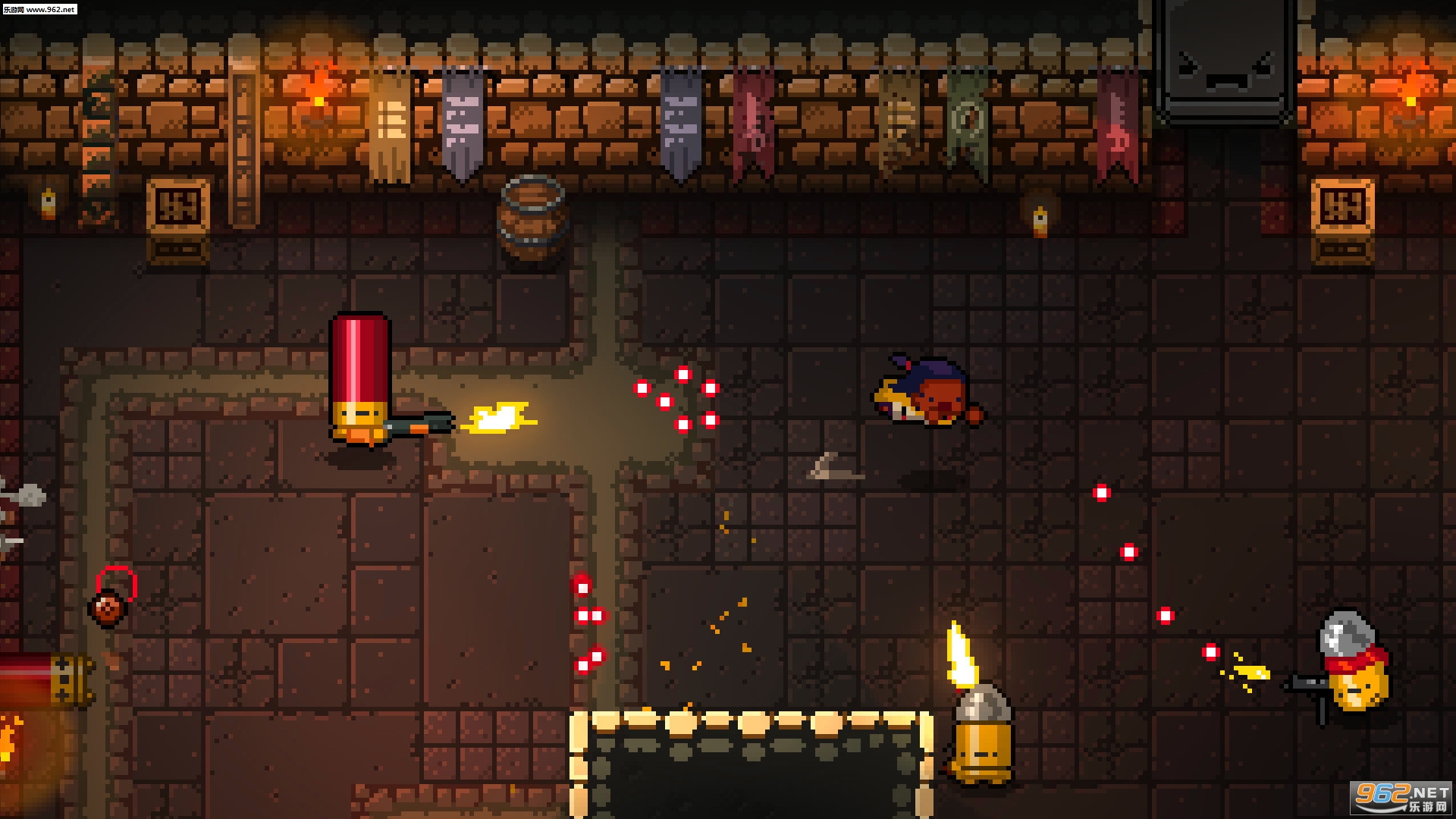 《挺进地牢》这款游戏中弹幕射击是其主要的元素之一,而画面中除了眼花缭乱的弹幕之外,依然有很多细节之处让玩家们感到欣喜。每个小房间内都放置着很多书本,箱桶,桌椅等等,而这些物品无一例外统统都可以被摧毁,散落的书页,灰烬在弹雨中飞舞,使整个画面看上去十分充实。