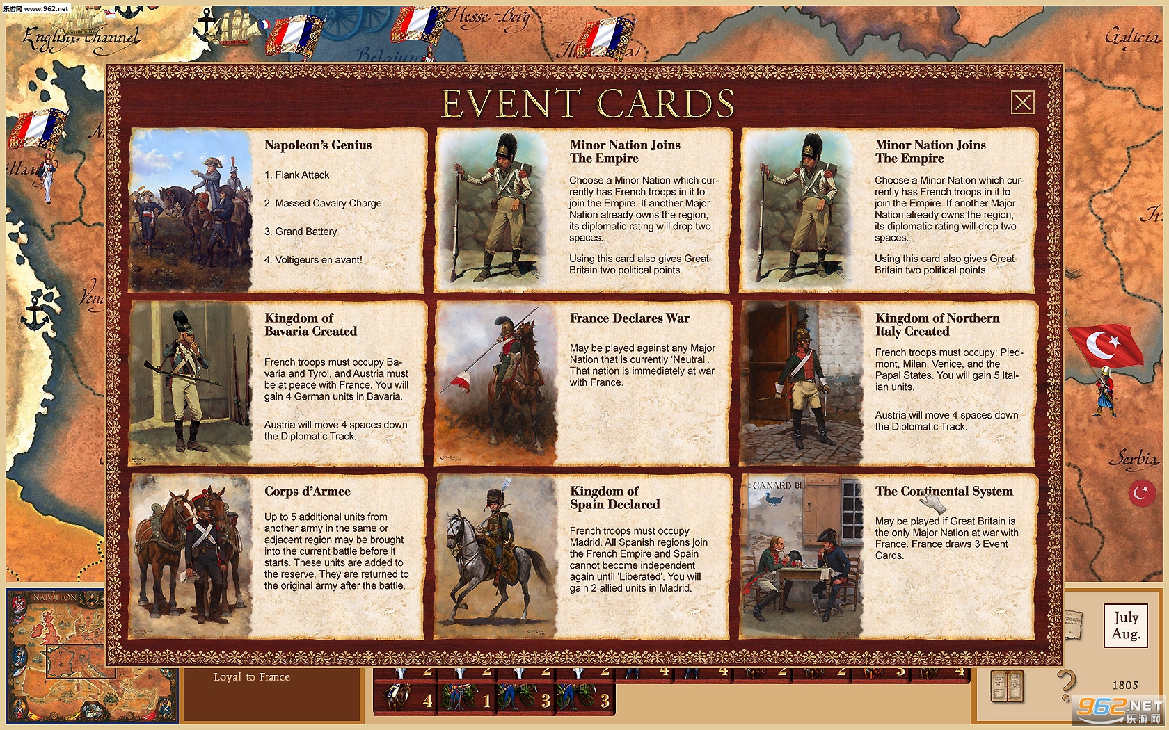 超百种艺术卡牌,这些作品均由世界知名的历史画师Keith Rocco创作。每张卡牌可以升级特殊单位、在战斗中获得优势、全新的职位、历史事件,甚至可以改变法兰西帝国的政治行动。