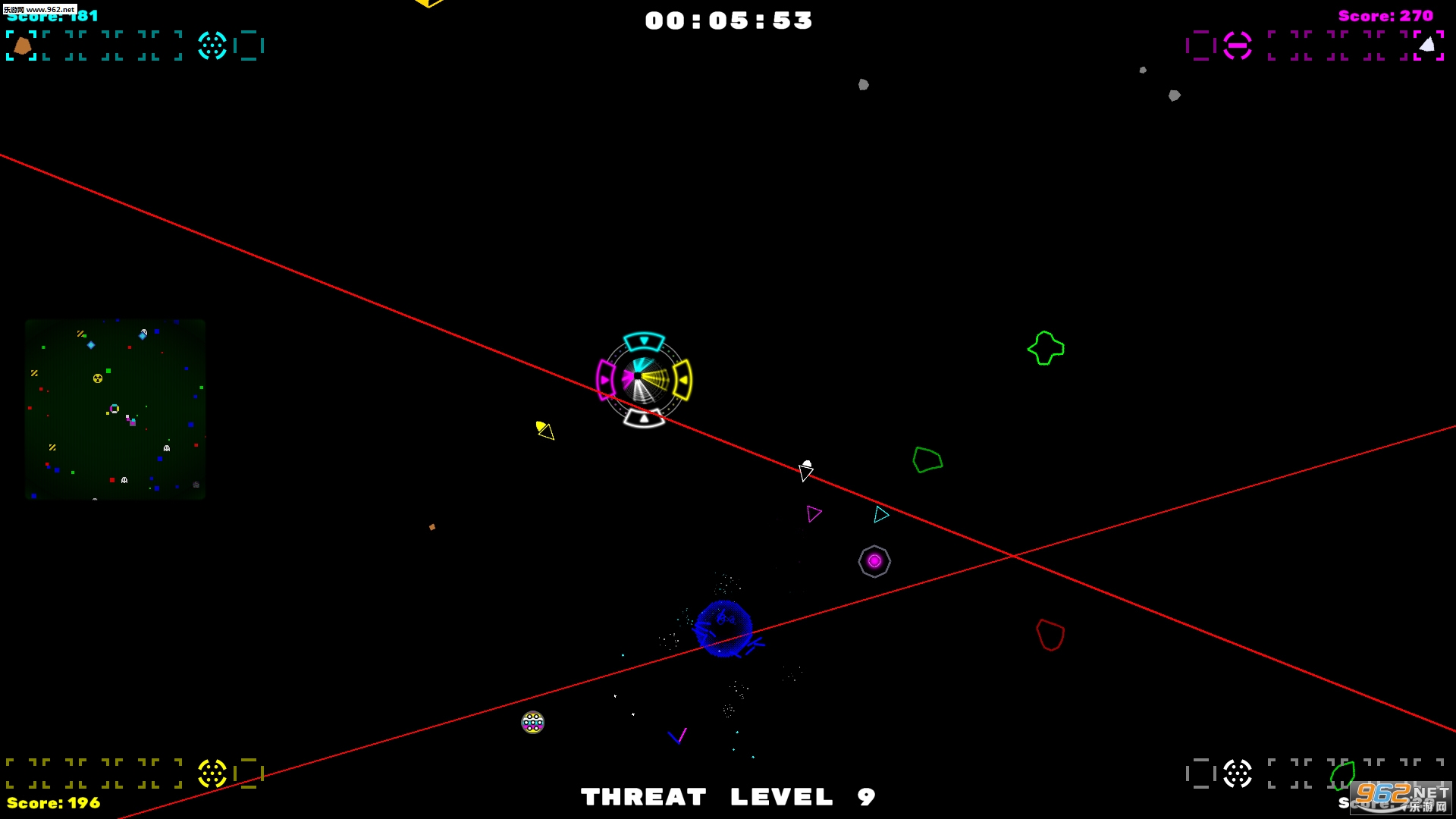 《CMYW》采用的是有趣的线条画风,游戏玩法非常简单,就是操控一个小三角形击落散落在各地的大方块,然后收集方块掉落的材料,努力生存的更久。开始游戏之后有一个计时器,随着时间的增加,你遇到的敌人(也就是小方块)会越来越多,更具挑战性,当然风险高了,奖励也会越来越丰厚,总而言之是一款玩法比较独特的另类射击游戏,