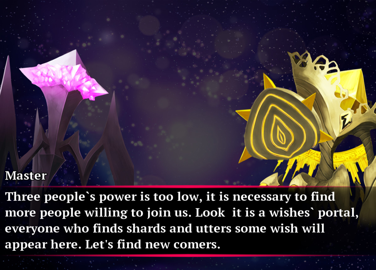 你在游戏中扮演一个刚出生不久的神奇生物,你不知道关于自己的任何事。听取了师傅的建议以及运用 Wishboard的能力,你能够满足生人的愿望。但是人们是真的想要自己的愿望得到满足么。