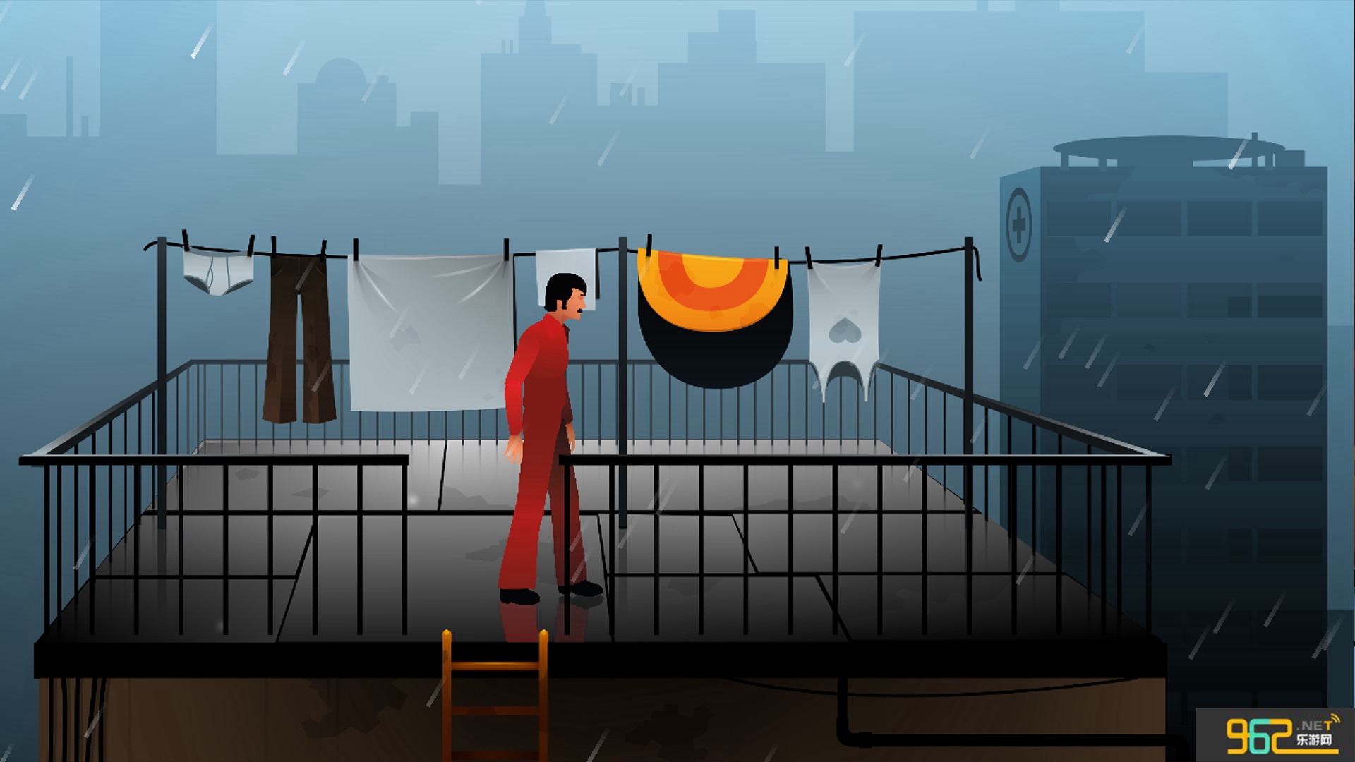 4、回到楼顶天台,再次从熟悉的洞口跳下去,来到窗边,用早前入手的木棍砸开玻璃,再把摊子铺在窗户上就可以逃出警察局了。