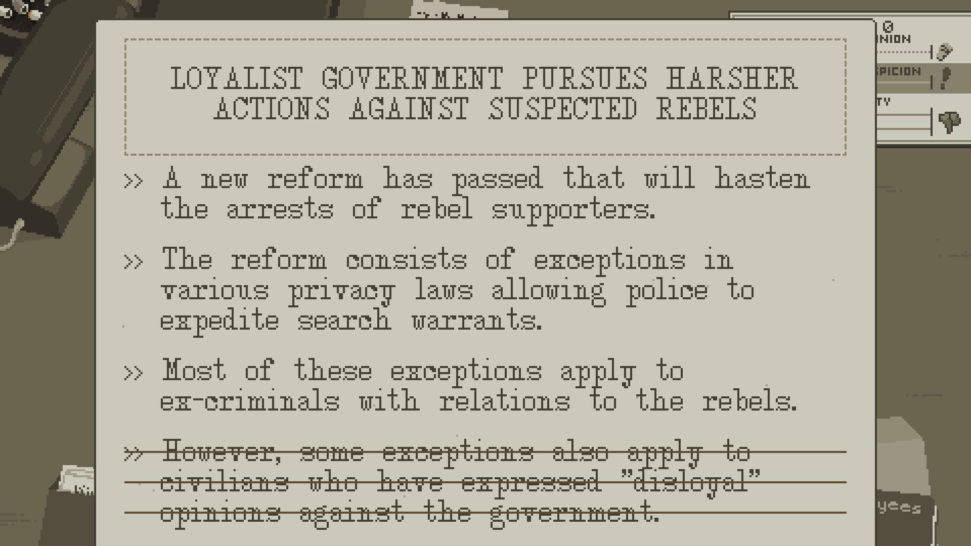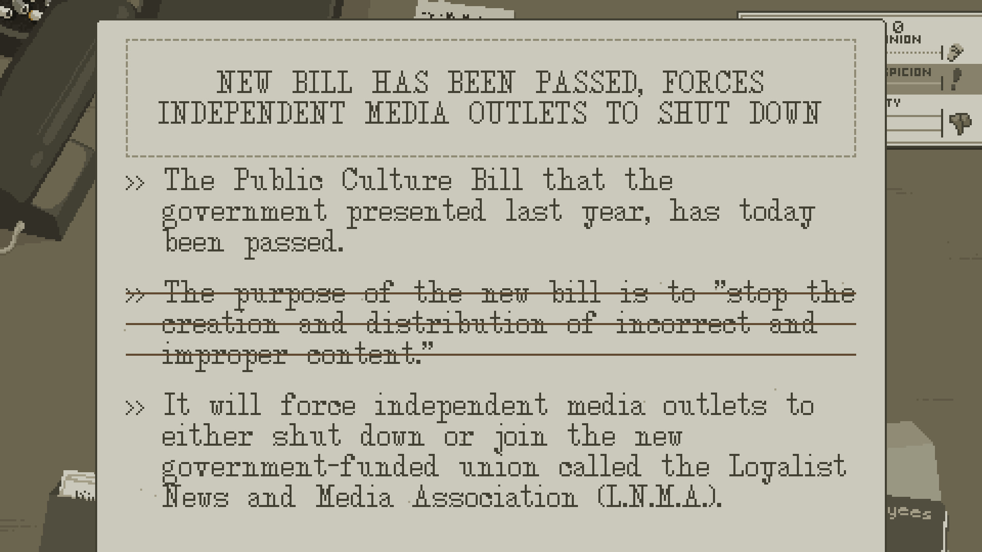 游戏中,政府会给你一本指南,希望你按照他们的要求去编辑报纸,并试图采取暴力手段使你服从他们的安排,让人民群众保持安静。这件事曝光后,人民对政府的满意度降到了冰点,甚至出现了多起统治者遭遇袭击的事件。现在,你有能力去影响群众对政府的看法,改变政府对群众的控制能力。