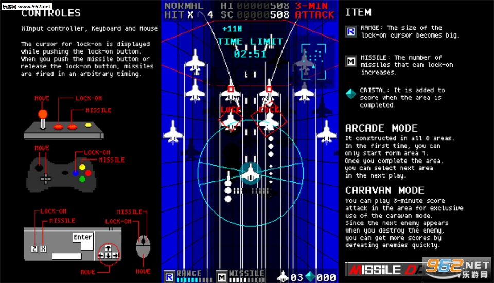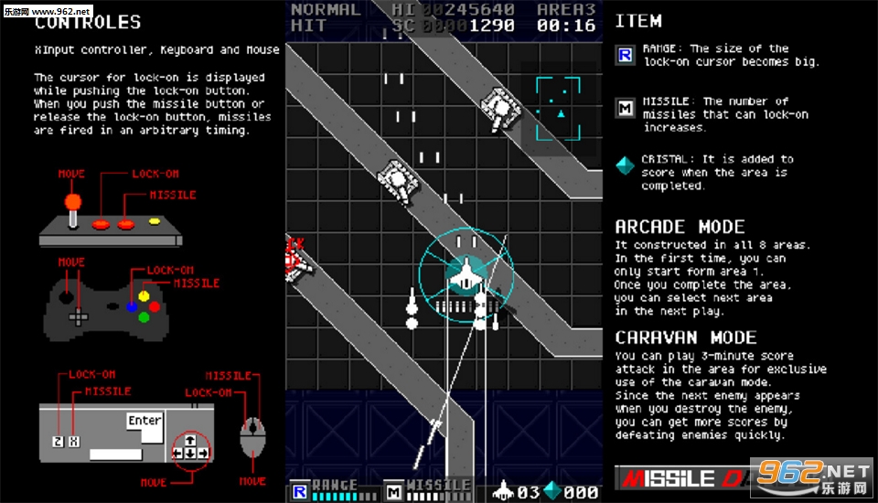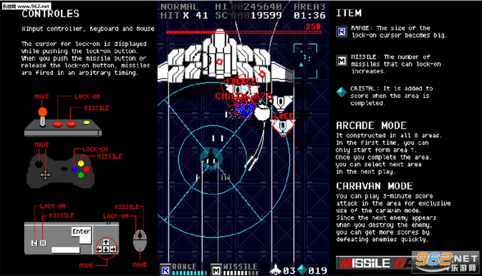 这是一个垂直滚动射击游戏。 你可以操作实现锁定导弹的战斗机导弹舞者。