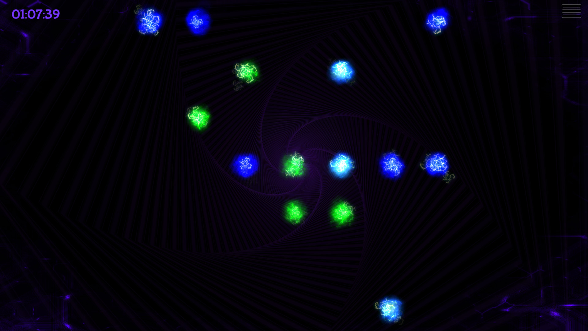 《能量循环(Energy Cycle)》的色彩搭配感很强烈,紫黑色的游戏背景,搭配上颜色各异的小球,给人一种非常漂亮的直观感受。游戏的操作非常简单,玩家只需通过鼠标点击,把出现在屏幕中的各色小球的颜色统一即可通过关卡,有点拼图游戏的意味。但操作简单,并不代表游戏就简单,当你实际进入游戏之后才会发行,原来想统一颜色还是有一定难度的。