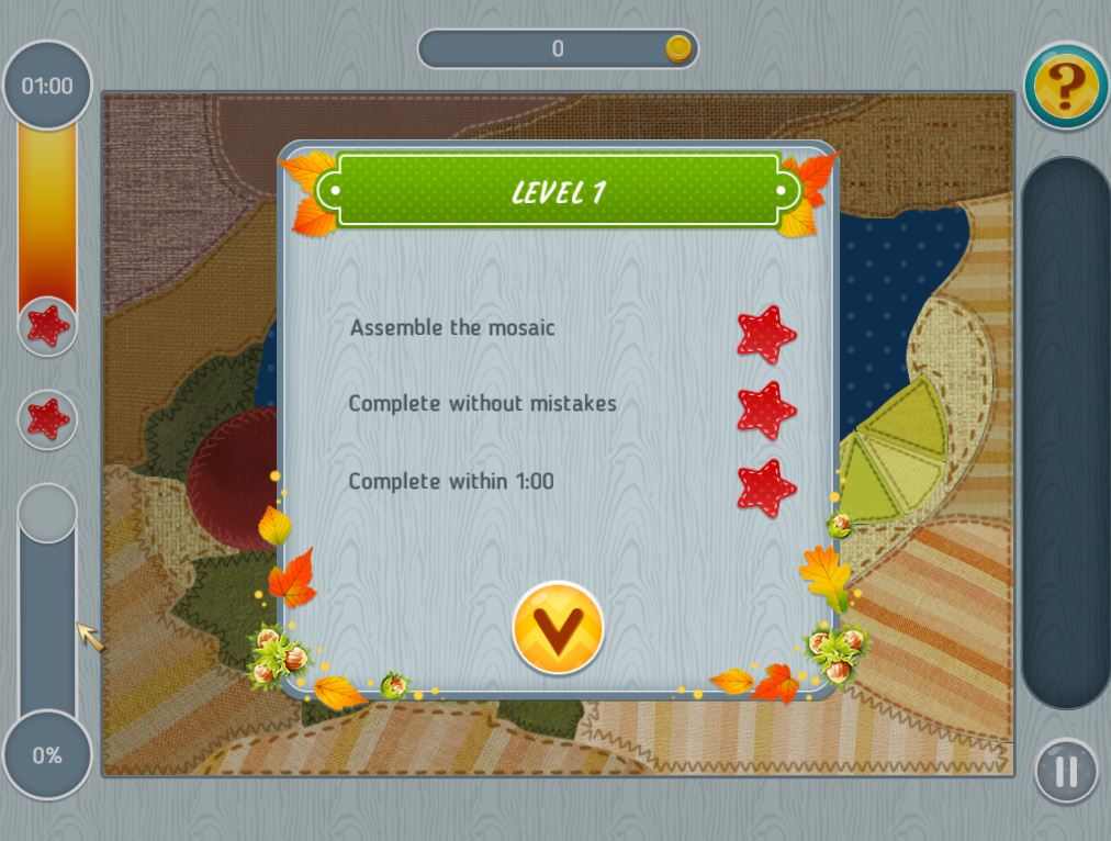 游戏同一般的拼图游戏基本一样,就是要拼成指定的图案,不过稍有不同的是,每个关卡都有三个要求,分别是完成拼图、不出现错误和在指定的时间内完成,虽然只完成拼图也能过关,但满足所有的三个要求可以获得更高的金币,金币可以用来购买提示和延长过关时间等的道具。