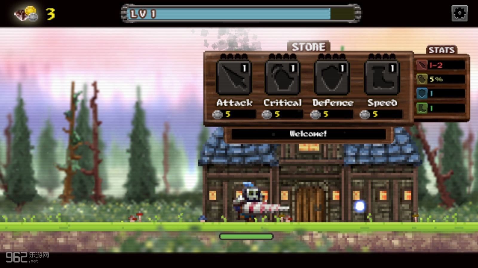 如果只是清怪通关的话,这款游戏的可玩性就要大打折扣了,为了避免这种情况出现,游戏特意增加了主人公的可塑性,以便玩家随自己的喜好打造不同款型的野蛮电钻叔。游戏中每过一段距离,就会碰到一个小屋(Store),在这里可以用打怪时收集的钱币根据自己的喜好提升主人公的各种属性,从左到右依次是攻击,暴击,防御,速度。
