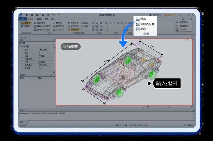 支持测量二维和三维模式,并保存测量结果;支持在Redline模式下向文件添加标记和注释