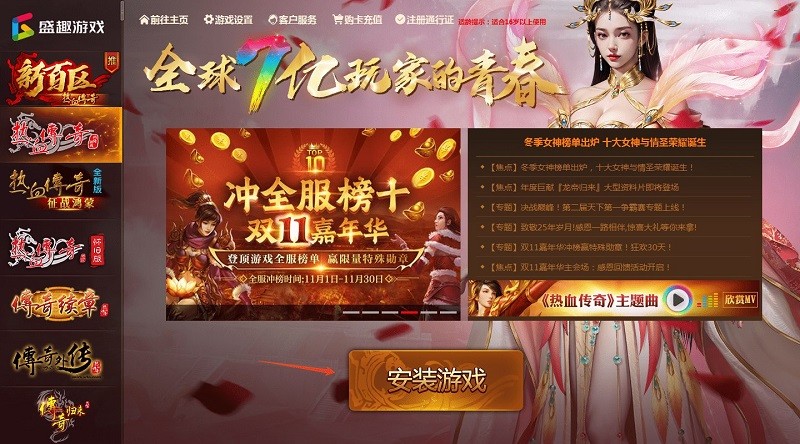 确定旁边的游戏是热血传奇后,点击安装;