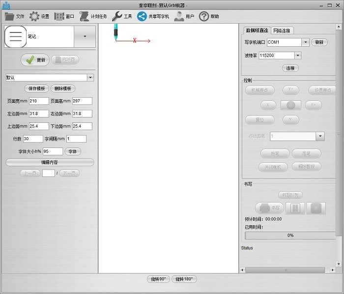 机型。因为机型众多,不同的机型最大的不同在于坐标系。使用本软件写字之前你需要设置坐标系和你的机器对应,否则写的字会出现颠倒等现象,启动程序后会出现以下界面。