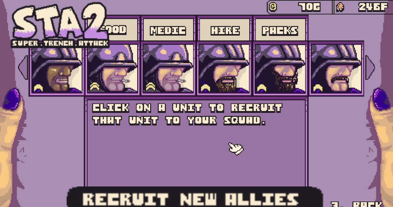 《超级战壕大战2(Super Trench Attack 2)》作为《超级战壕大战》的需要,依旧延续了前作战争题材的背景和像素风格的画风。不过本作的主角不再是一个刚入战场的新兵蛋子,而变成了一个身经百战的中尉。你已经取得了敌军的作战计划,现在要做的就是把这份作战送回总部,结束这场战争。故事采用随机生成事件的方式进行,拥有丰富的动态事件、各种不同的任务和多种支线选择。对本作感兴趣的玩家不妨试试。