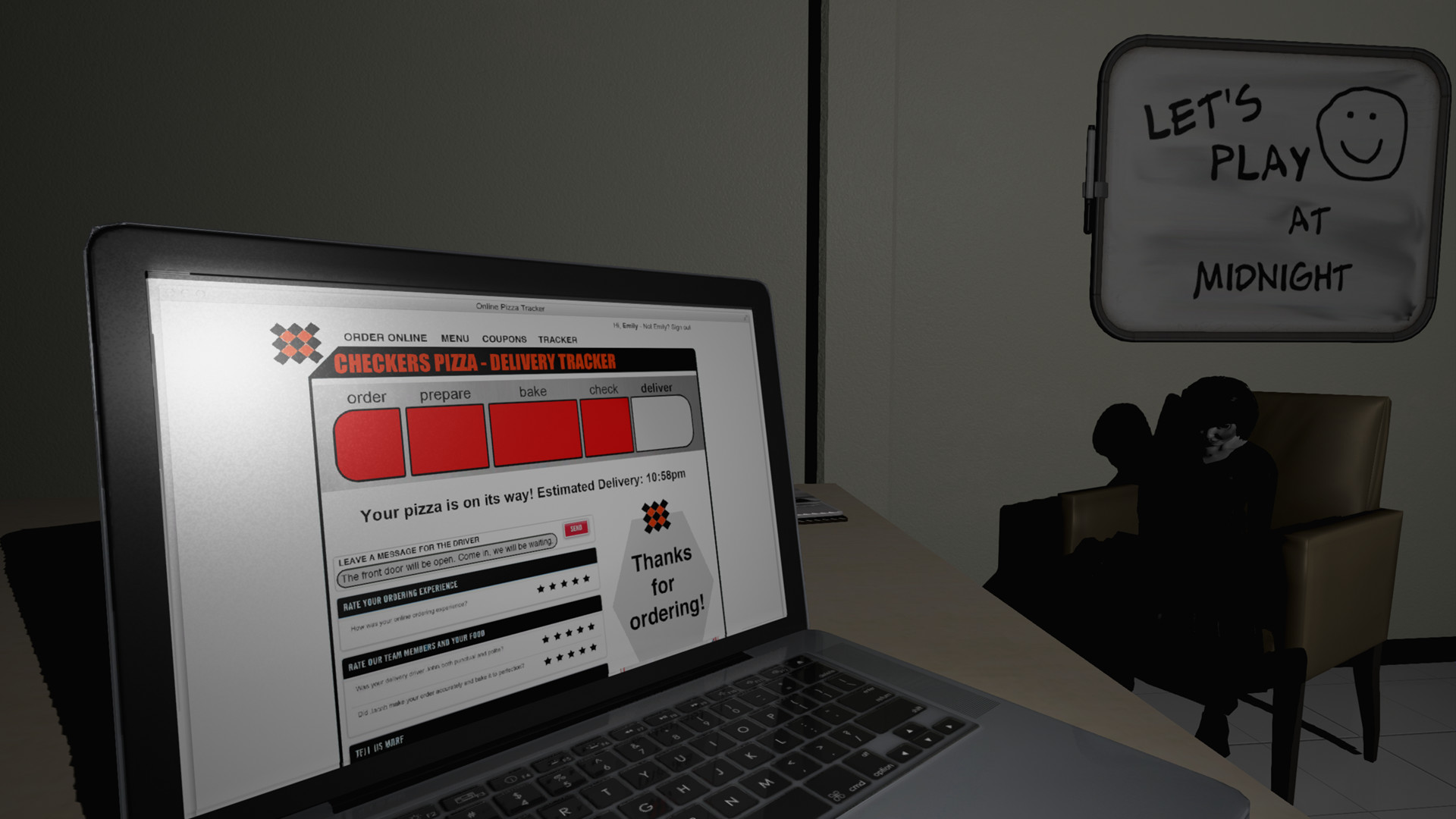 在《艾米丽玩闹鬼(Emily Wants To Play)》中,你是一个送披萨的。深夜11点钟,你来到最后一处要送披萨的地方,这户人家的房子窗户都用木板封了起来,院子里杂草丛生,但灯却是亮着的并且前门也打开着。由于天上下着雨,浑身被淋透的你毫不犹豫的走近房子,但是不久你就后悔这么做了。