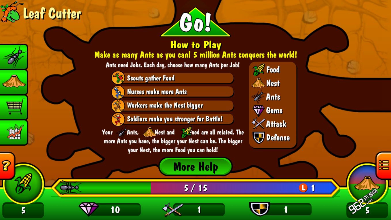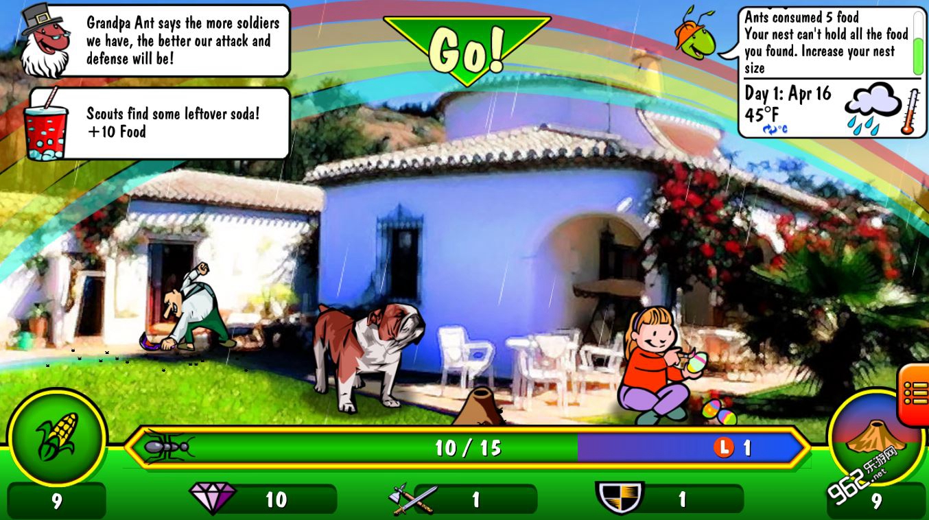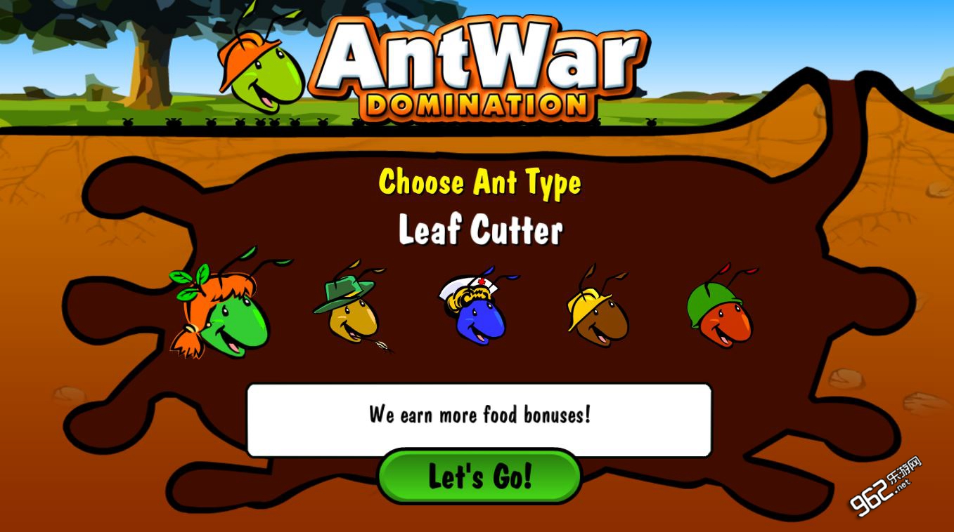 《蚂蚁统治战争(Ant War: Domination)》是一款非常简单的小游戏,你需要使用各种水果、作物等食物喂养蚂蚁让它们繁衍,然后通过各种方式训练蚂蚁让其获得新技能,之后在通过战斗等方式扩充自己的土地,最终达到征服世界的目的。