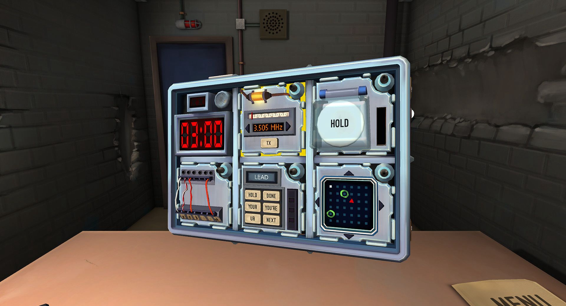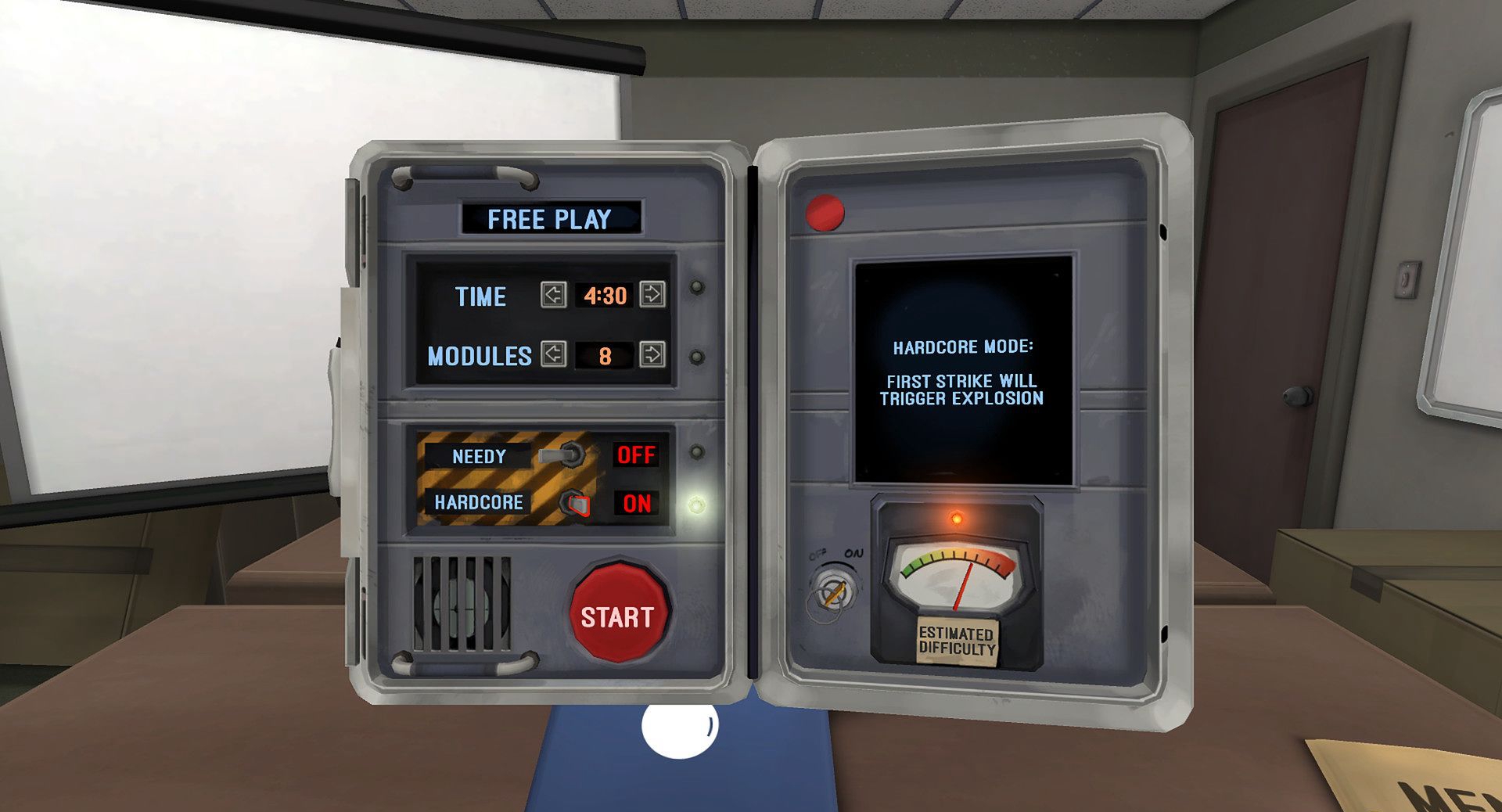 一个玩家需要戴上Oculus Rift,发现自己置身于一个放置了随机生成的定时炸弹的房间里。其它的玩家则扮演“专家”,他们手头有一份通用的拆弹手册,他们无法看见戴着Oculus Rift的玩家所能看见的画面(这个需要玩家们配合,将屏幕转到不可见的位置,或者关掉它)。