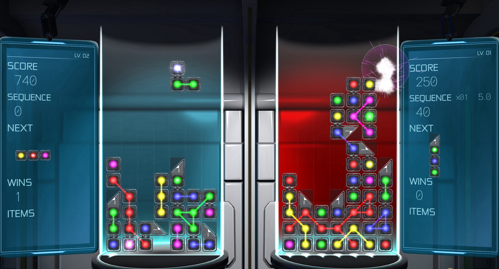 如果你接触过俄罗斯方块,那么你上手《正极》将会变得非常容易,游戏中由不同颜色方块组成的不规则图形会从上方掉落,玩家可以使用向上方向键调整图形的形状,通过左右方向键来实现图形的左右移动,通过向下方向键显现图形的加速下落。当下落的图形接触到下方固定图形之后,其组成图形的不同颜色的方块回合图形周围的对应颜色方块进行连接,当该下落的图形中存在闪光方块时,一旦闪光方块和其对应颜色的方块连接上,那么将会实现消除效果。所以游戏过程中玩家需要关注存在闪光方块的图形,和里放置它,将有助于整个下方固定图形的消除。