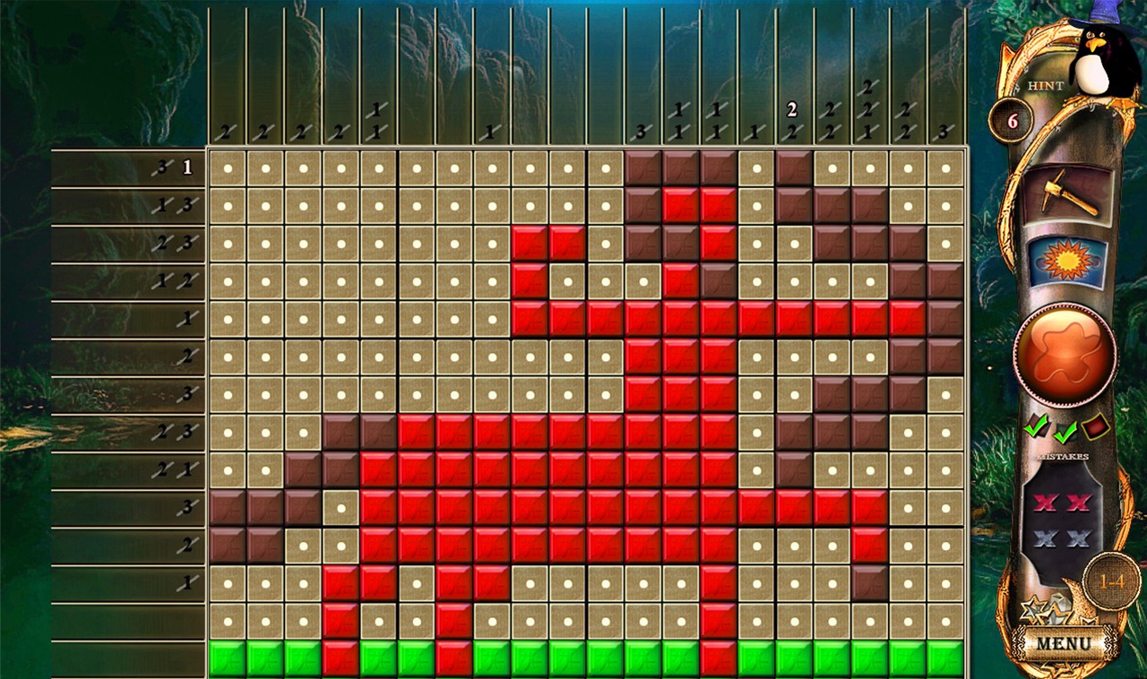 数图游戏是由方格区和方格区之外的数字组成,每一行方格的前面以及每一列方格的上面都会存在一些数字,这些数字代表着当前行或者列中所要填充的方块数量,比如某一行前面依次存在2和1两个数字,那么这一行应该要填充三个实心方块,并且会有两个连续的方块在一起,两个连续方块应该填充在靠左侧位置,至少空一个方格之后才能填充单独一个实心方块。如果某一列上面依次存在5和4和2共三个数字,那么该列从上至下的方格填充区需要填充十一个方块,其中五个连续的方块填充于偏上位置,至少空一个方格之后填充偏中位置的四个连续方块,再至少空一个方格之后填充偏下位置的连续两个方块,注意前面所讲到的空出的方格,这中所要空出来的方格数量是推理出来的并不绝对是一个方格,有可能是两个,有可能是三个,或者是更多。如果玩家已经确定了某个方格一定是空的,那么你可以用鼠标右键点击一次该方格,该方格上就会出现白色圆点的标记。