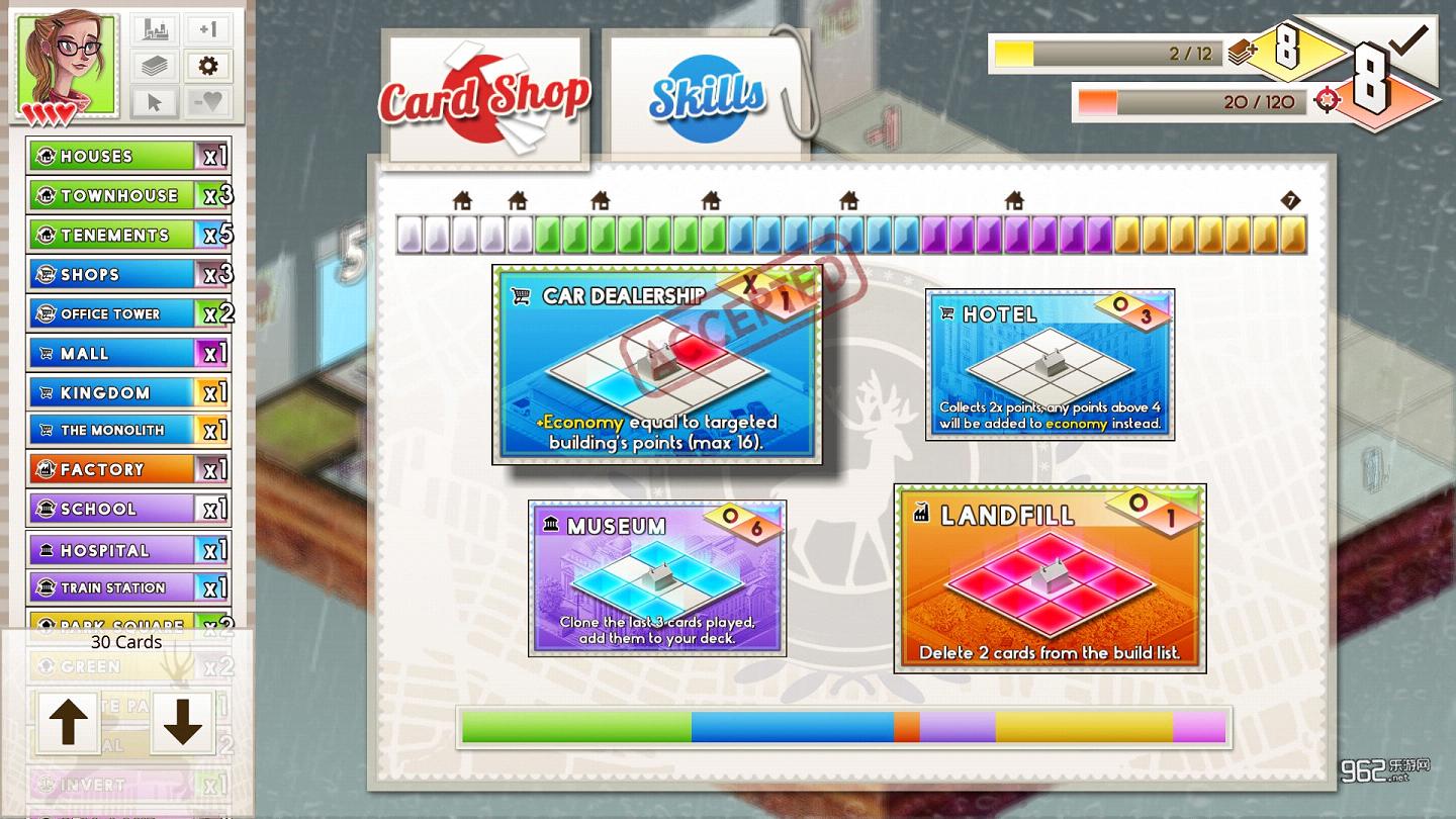 模拟城市建设游戏大多是偏休闲风的,但是若与卡牌桌游等扯上关系,那玩起来可就不是那么简单了,Concrete Jungle 《水泥丛林》就是这样一款强策略性的模拟城建游戏。城市的整体规划都定位在四方形的网格中,以每个十字路口为界限,玩家需一块一块的制定好自己的版图。合理的规划不仅能使得百姓安居,更能让城市经济稳步增长,这也是游戏的策略性所在。