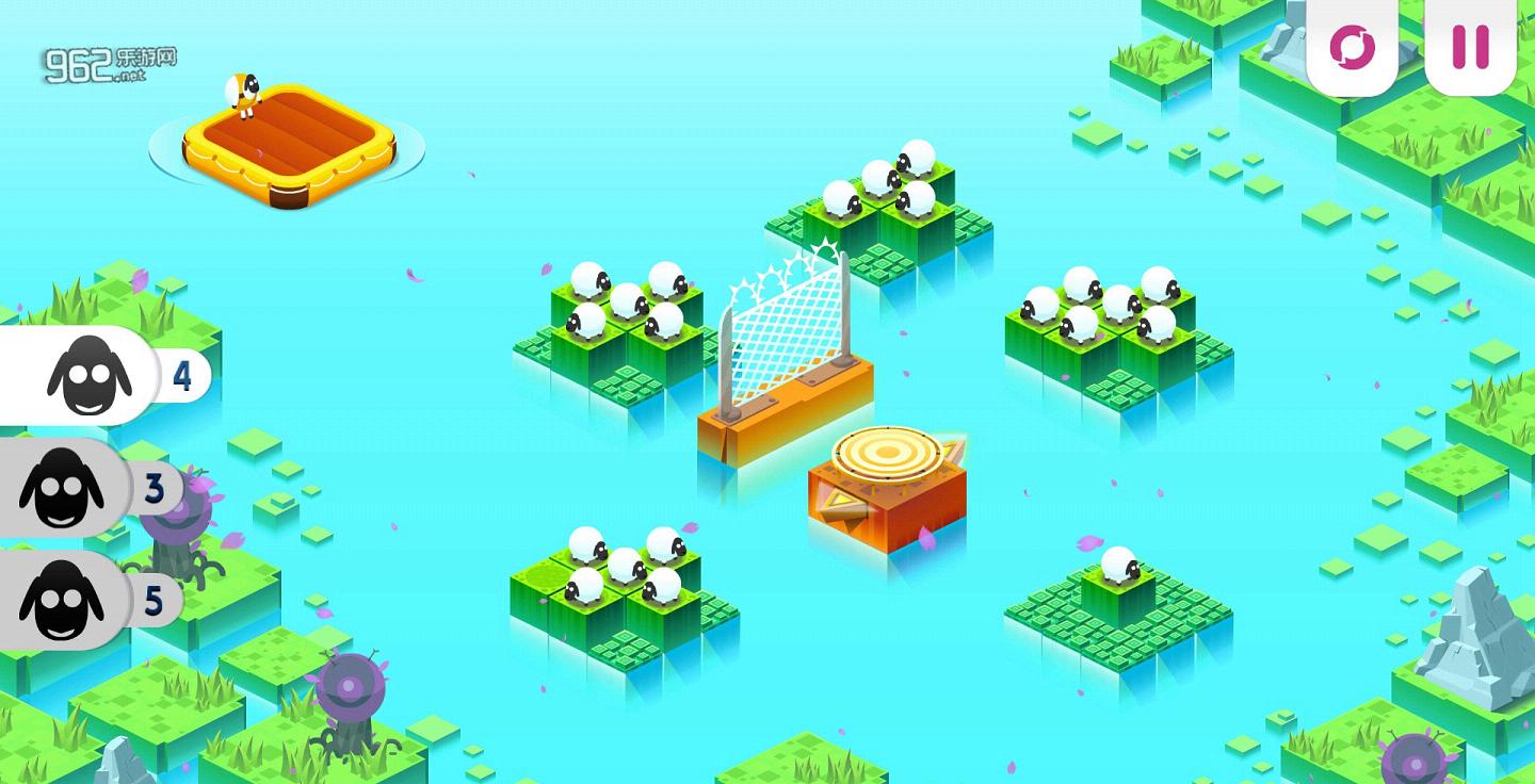 游戏中以羊群的分离合并为主题,玩家要将羊群分配到旁边的竹筏上,通过在多个平台上移动羊群来合并或减去羊,达到竹筏的核定承载数目。