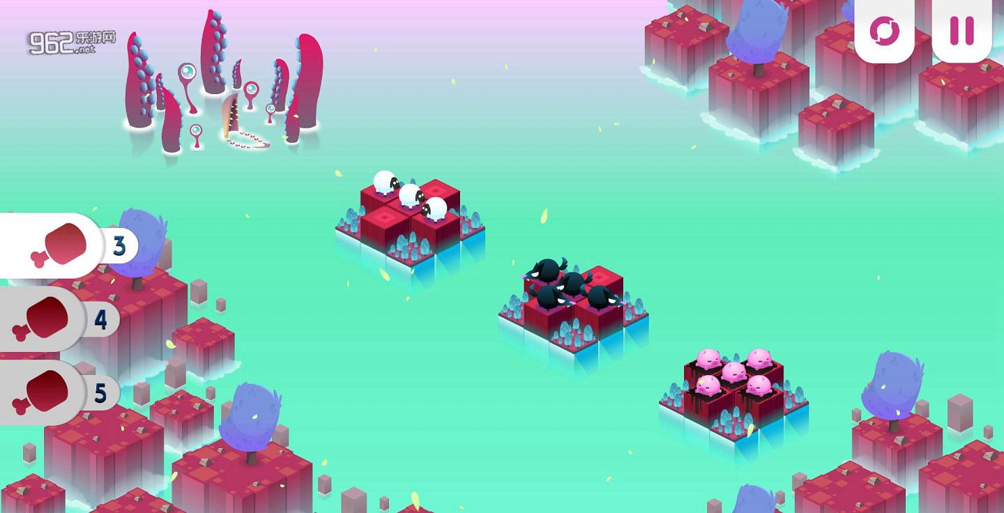 《羊群分离法》是一款既可爱又有几分血腥的奇葩益智游戏,以羊群的分类和合并为玩点,玩家要按照游戏给出的数量要求,让不同平台上的绵羊数量减少或者增多,最终跳上救生艇的绵羊数量要与游戏的数量要求相等。