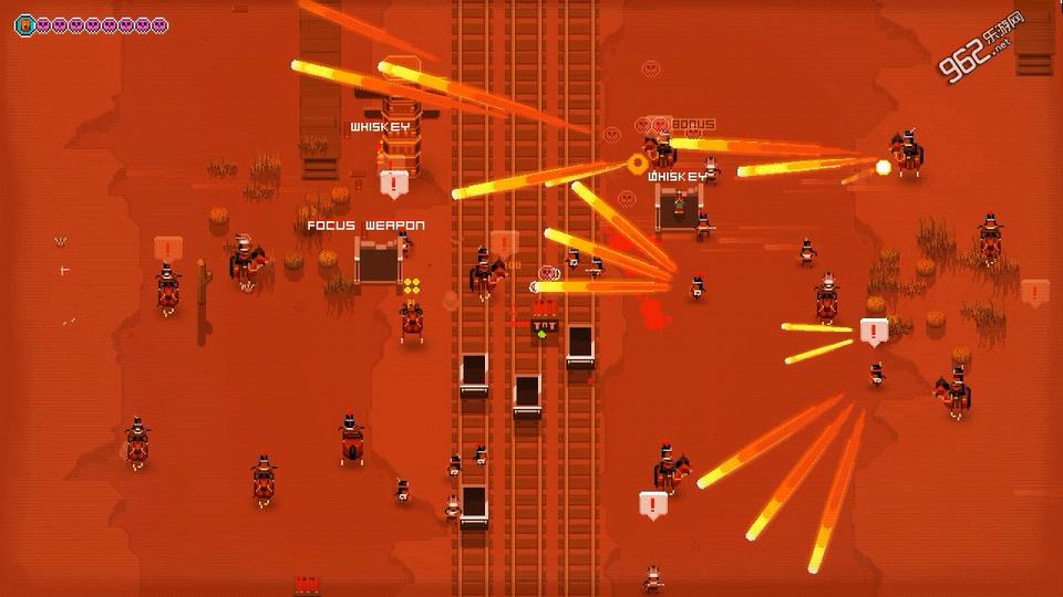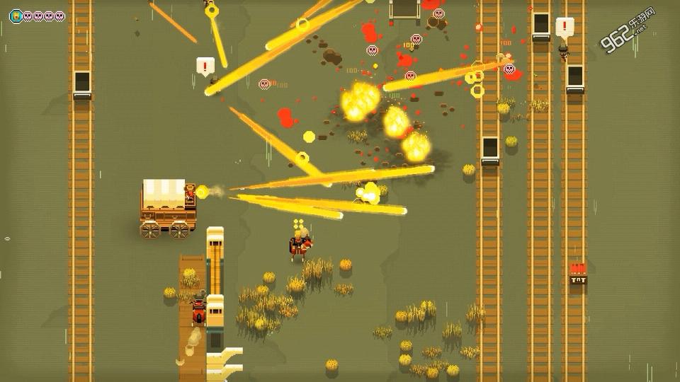 虽说游戏的整体画面只是简单的像素风,但是细节还是有的,比如呼啸而过的火车,被水流冲过的原木等等,同时在这个美国西部风情的村镇当中还有着着各种各样的房屋出现,虽然十分简陋,但是还能看出这款小游戏的诚意,而游戏中的弹道确实这款游戏当中最有意思的地方,当敌人的火力猛烈之后会发现整个画面都是弹道,像放烟花一样,简直不敢相信他们是在打枪。