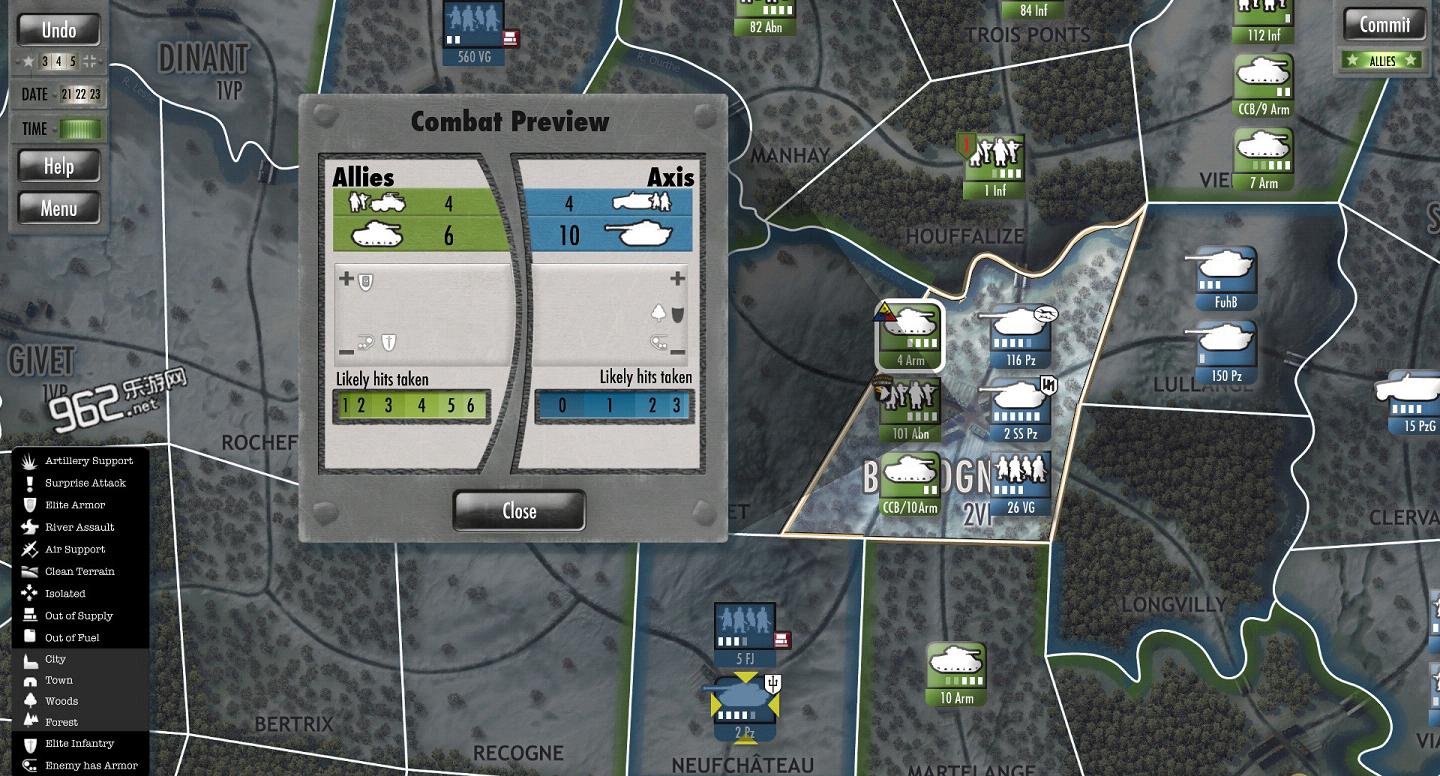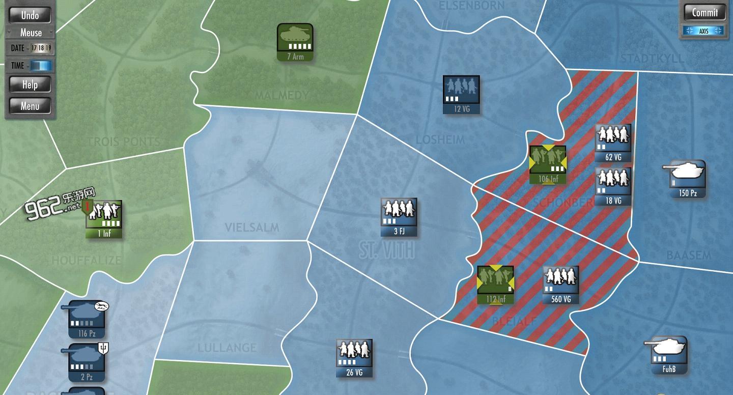 《坦克大决战(Battle of the Bulge)》游戏的核心画面是游戏地图,或者应该说是突出部战役战略地形图。这里不需要花哨的技巧,追求的是对战场地形的精确描绘,追求的是对战局形势的清晰展现。不需太多艳丽的色泽,只需泾渭分明的标识:森林,雪地,城镇,河流,丘陵,空地,道路,桥梁在地图上一一排布;不同色的边框将各个区域以及归属权明确区分;分属两方的蓝绿色步兵单位,机械步兵单位,装甲单位三种参战兵种在战略地图上行进割据。
