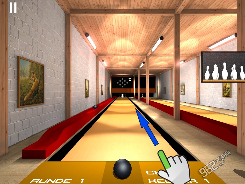 经典的九柱保龄球玩法,使用保龄球击倒九个球瓶