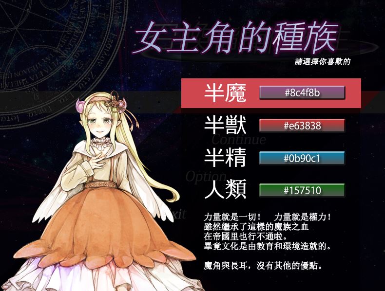 半魔:力量就是一切!力量就是权力!虽然集成了这样的魔族之血,在帝国里也行不通啦。毕竟文化是由教育和环境造就的。魔角与长耳朵没有其他优点。