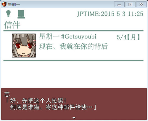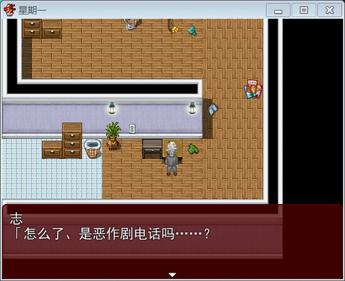 本作是玩家使用《RPG Maker VX AceRTP》自制的一款非常简单追踪恐怖解谜游戏,由于是使用《RPG Maker VX AceRTP》制作,那么画面和游戏性当然就很一般了,不过剧情还是蛮有特色的(笑)。玩家扮演一名由于星期一不想上班而被星期一小姐追逐的故事。你要在她的追逐下寻找线索摆脱追逐,生存下来。