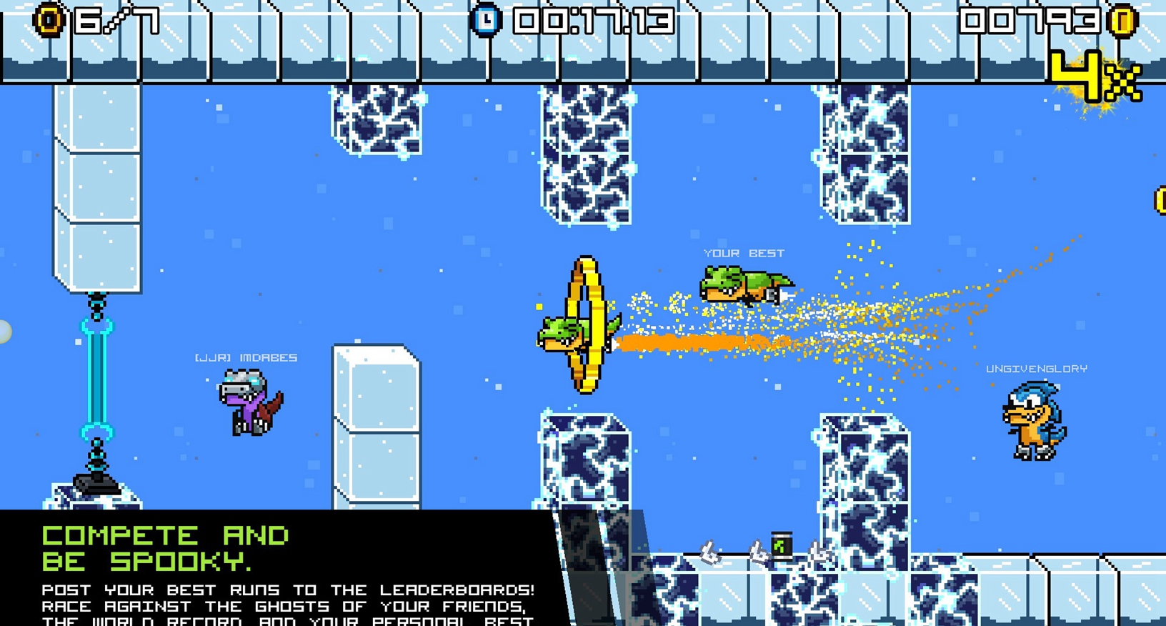 在《喷射霸王龙》中,你要完成各种高难度的挑战,你控制这只霸王龙只能失误两次,然后就会死亡。多使用游戏中的检查点可以让你挽回失误所造成的损失,不过如果想获得更好的分数,还是需要一定的操作熟练度。