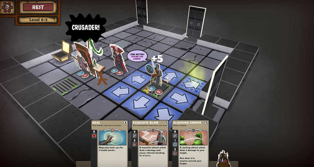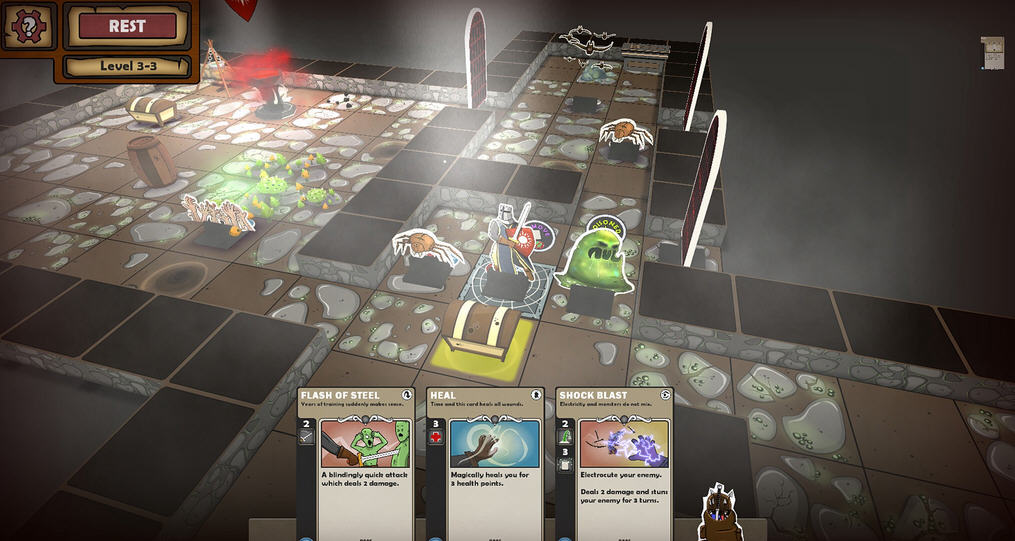 顾名思义,在《卡牌地牢》游戏中,玩家从装备、符文等道具到施咒攻击、解除陷阱等动作,都一律以不同样式的卡牌形式呈现,而每回合能使用的卡牌数目有限,因此玩家需要在每回合都对本回合的行动进行取舍和规划,从而令玩家体会到到游戏制作人“一回合只能做一件事,请明智选择。”的游戏理念。