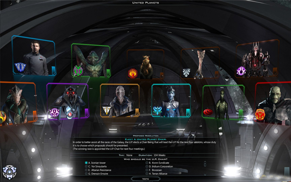 “玩家有非常多的工具可以使用,从外交手段到资源交换。游戏中中非常丰富的研究方向,可以引导出种类及其丰富的星际战舰的设计和配置。玩家在行星开发,星站建设,内部谈判,思想意识等等中做出的选择,都会影响银河系的变化。”