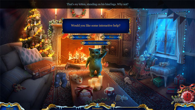 好吧,我承认我救了一只可爱的小喵,起名叫赛门,有谁会任由风雪去伤害卧在你家门口的小可怜呢!也正是我的这份善良,赛门在我的睡梦中把我叫醒,带我到了喵们的世界,圣诞老人因为圣诞星星被盗而郁闷不已,城镇的气氛也很低沉,看来这次的任务就是找到星星,换大家一个完整的圣诞节啦!!!我看到你了,穿靴子的鞋猫,快把星星交给我......