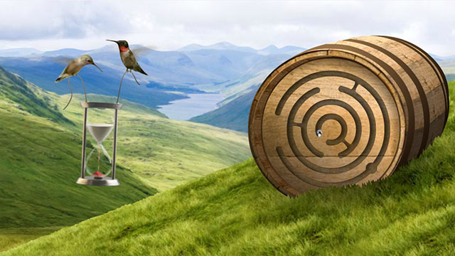 第一章中玩家通过滚动鼠标的中间键来控制滚筒前后滚动方向,进而让在桶上迷宫中的小球离开迷宫脱离木桶。
