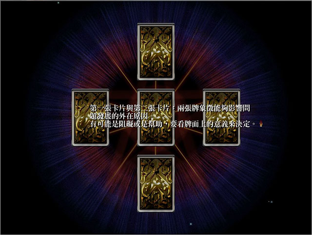 《Tarot:魔女的塔罗牌》是一款卡牌收集游戏,在该作品中玩家以命运的占卜为契机,在时之魔导师娜雅的指引下通过大十字占卜法在卜算的同时收集各种不同的卡牌。游戏中包含了二十二张大阿卡那主牌,分别对应着愚者、魔术师、女教主、皇后、皇帝、教主、情人、战车、正义、隐士、命运之轮、坚强、倒吊人、死神、节制、魔鬼、高塔、星星、月亮、太阳、审判、世界,每次占卜玩家仅可抽取五张,五张卡牌或许会有相同的牌面,所以玩家只有通过多次的占卜才有可能找出所有塔罗牌。游戏篇幅比较短,感兴趣的玩家可以体验一下该作品,为自己算上一卦。