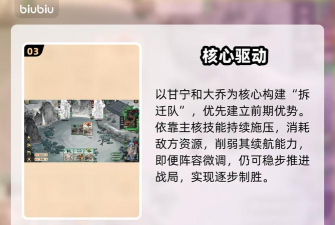 甘宁与大乔是很经典的拆迁阵容组合。甘宁可在获得黑桃花色的手牌后拆掉对手的牌,且能在出牌阶段主动将手牌全部变成黑桃花色,并把它们弃置回牌堆,随后可再摸等量的牌。若大乔在登场时所选的武将为甘宁,那么就能在甘宁弃牌时发动君生别离技能,主动选择另外一名角色并弃置对方一张牌,这也让甘宁与大乔有着极为适配的联动效果。特别在甘宁每回合都能主动弃牌的情况下,大乔也能因此有着较为稳定的技能发动频率,与甘宁一道形成双拆迁组合。