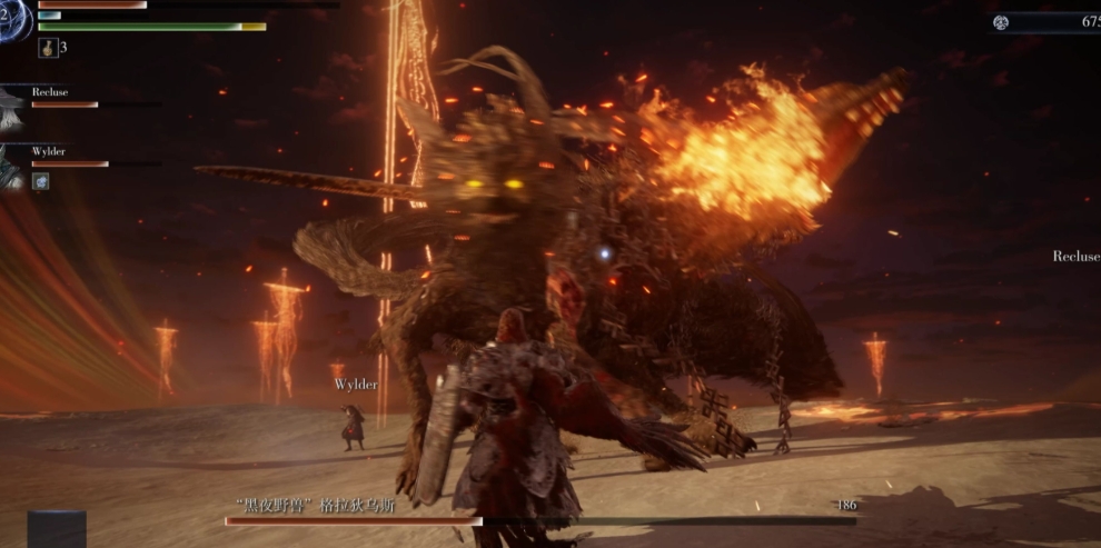 这个阶段它会偶尔分裂成三只狗,分裂瞬间产生的火焰会造成伤害,一开始时尽量翻滚躲避一下,如果玩的是单人模式,整个分裂阶段最好都不要输出,跑得越远越好。格拉狄乌斯分裂期间是根据时间还原的,分裂时需要注意其中一只狗如果仰天长啸,三只狗就会集体发动喷火啃咬组合攻击。当格拉狄乌斯合体后它的两个甩剑招式都会多出一段插地攻击,躲避时多翻滚一次就可以避开。