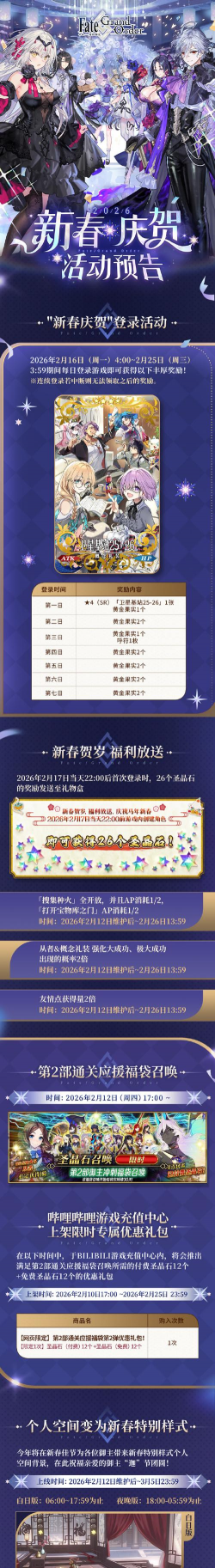 活动这边一共安排了3个,情人节活动和巡灵祝祭第10弹的时间基本上跟往年差不多,没什么太大变化。不过重头戏还是2月12日到2月26日,开启的2026新春庆贺活动。按照以往的经验来看,官方会把日服那边冬日祭,还有除夕倒计时的呼符、石头和金苹果这些东西打包发放,而且国服这边通常还会额外多给一些。去年的实际发放量就比日服多,冬日祭的纪念礼装估计也会一起送。